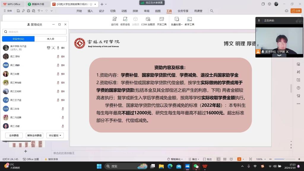 马子涵、金昌辉通过腾讯会议进行了线上宣讲,介绍了国家和学校的资助政策体系、申请流程及注意事项等,现场解答了同学们的疑问,帮助大家读懂资助政策、用好资助政策。