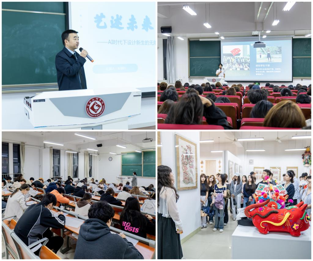 我校创新创业校级团队导师朱丽叶老师结合自身丰富的经验和成果,以生动的案例和深入浅出的语言,向同学们阐述了科技竞赛对于大学生创新思维和实践能力的重要性,鼓励同学们在学习和实践中不断挑战自我,开拓创新思维。两位研究生学长介绍了自己的考研经历和心得,鼓励同学们乘风破浪,勇往直前。国家奖学金获得者丁姝月从思想、学习、工作等方面展开交流分享,她建议同学们端正学习态度,培养兴趣爱好,丰富大学生活,在社会实践与志愿服务中收获成长。全体新生参观了学院民间美术展览馆和艺术展厅,领略传统工艺的独特魅力,鉴赏优秀作品的色彩神韵,引导新生坚定文化自信、勇攀文艺高峰,以奋斗之笔绘就青春画卷。
